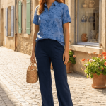 Caroline porte le chemisier floral bleu CELENA avec le pantalon en lin bleu marine MILLA
