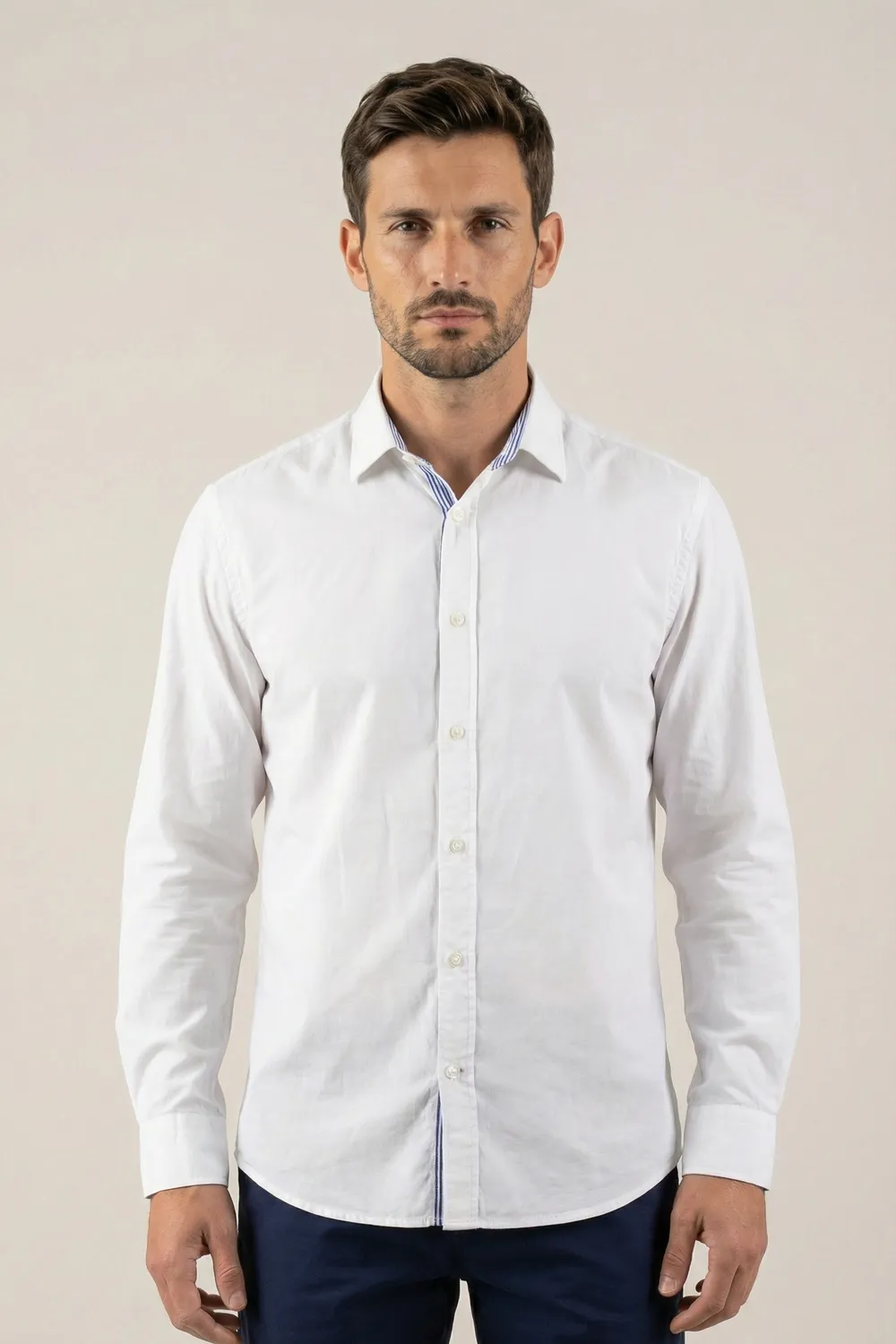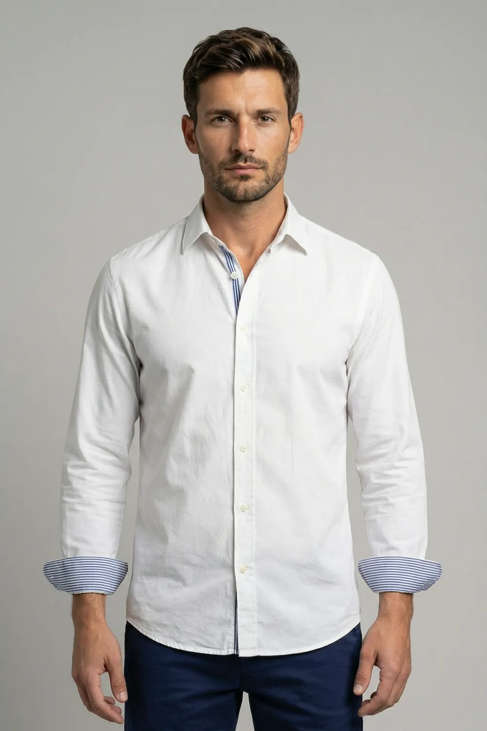Chemise en coton blanc homme manches longues avec revers contrasté à rayures bleus et blanches