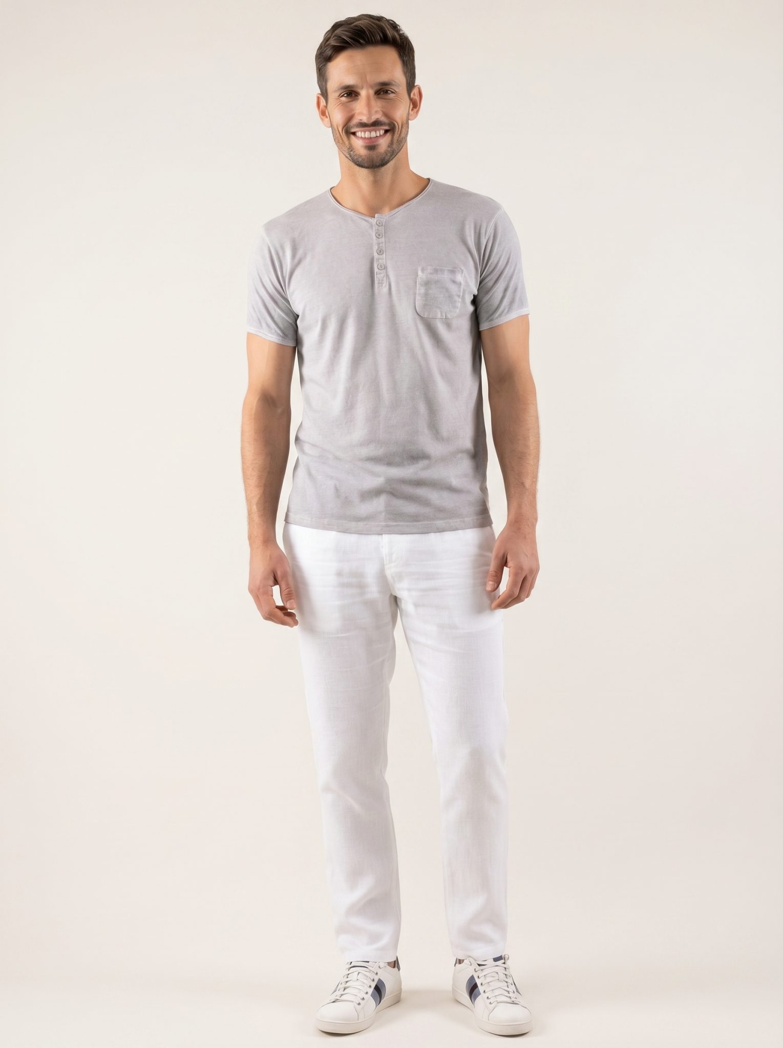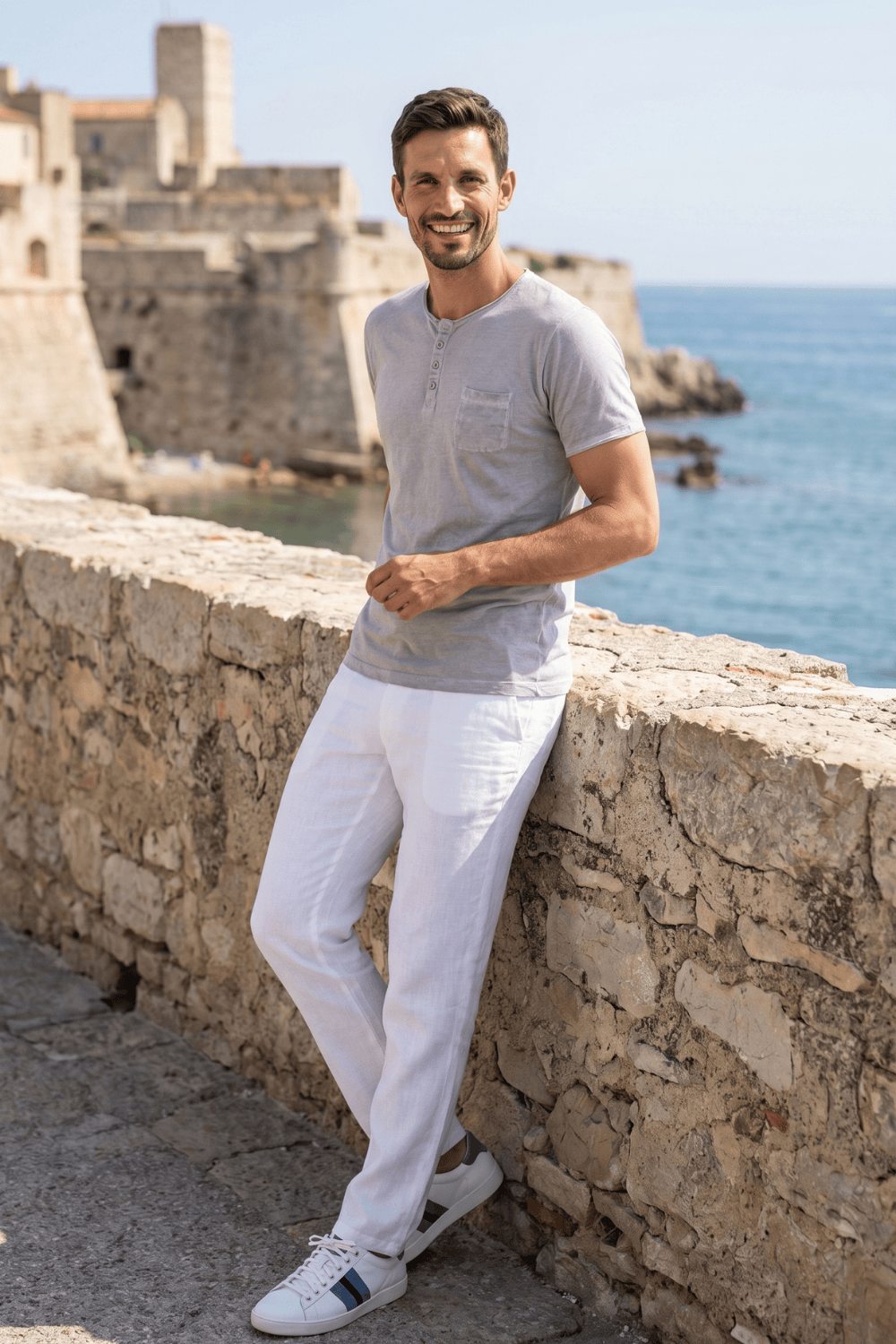 Pour un look casual et raffiné, associez le pantalon DYLAN à un t-shirt en coton léger et des baskets en toiles. Pour une tenue plus élégante, optez pour une chemise en lin et des mocassins en daim.