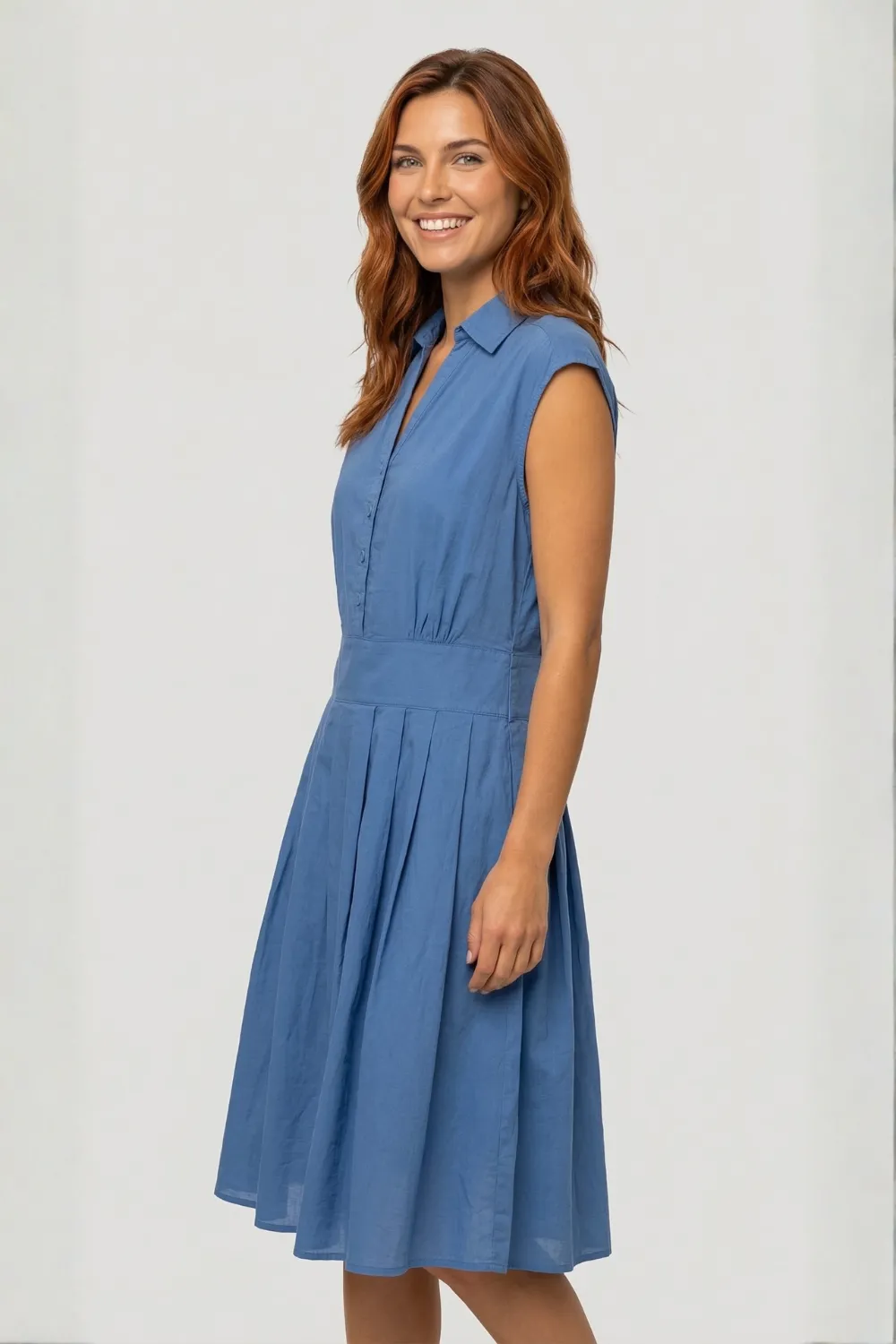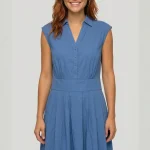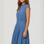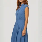Confectionnée en 100% coton, cette robe sans manches combine l’élégance d’un haut chemise et la légèreté d’une jupe fluide délicatement plissée.