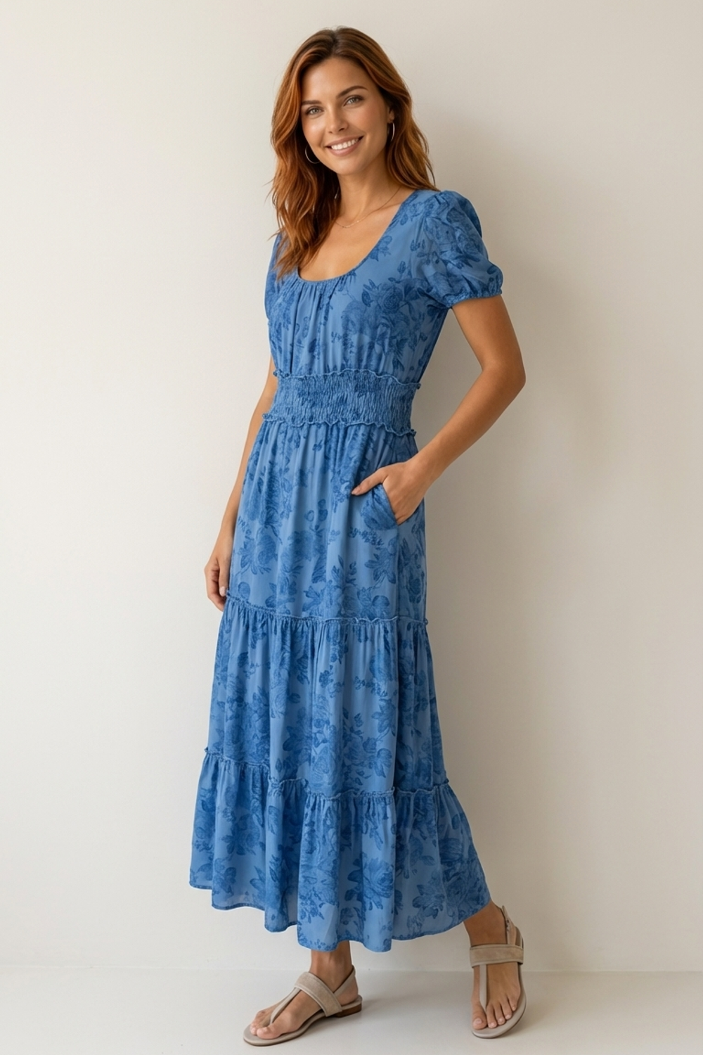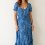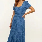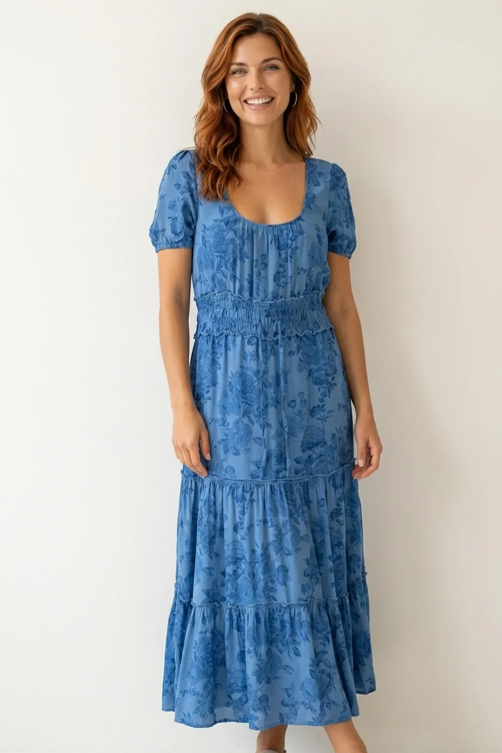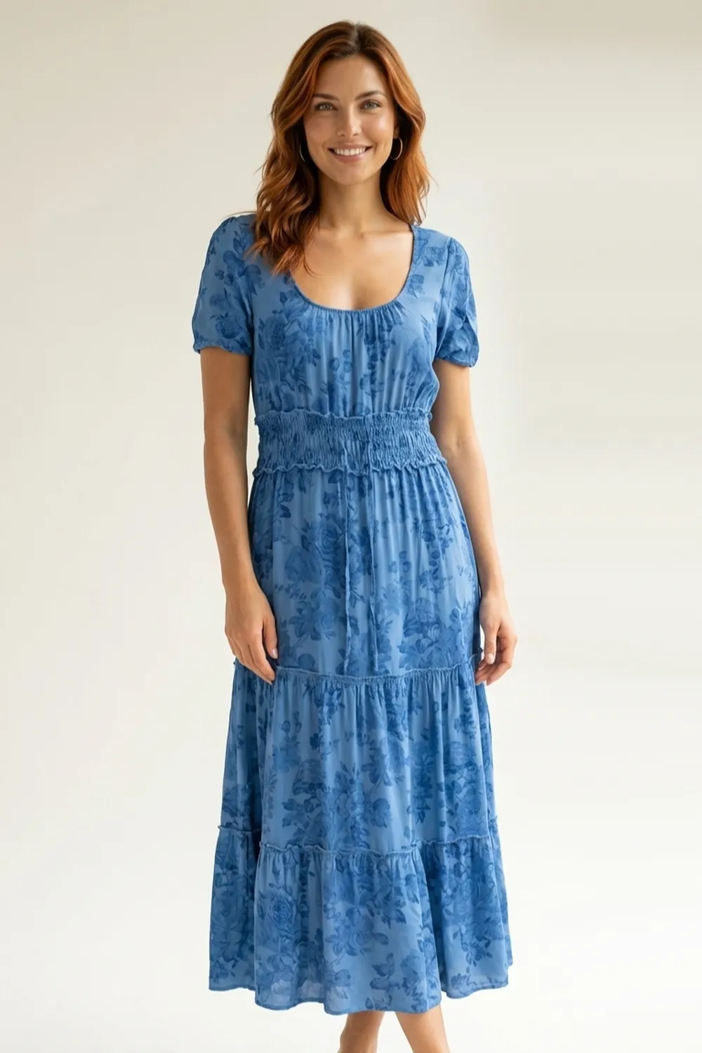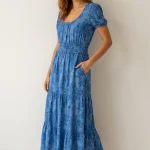 Son imprimé floral bleu ton sur ton et sa large taille smockée dessinent une silhouette gracieuse et féminine.