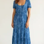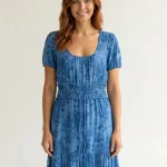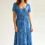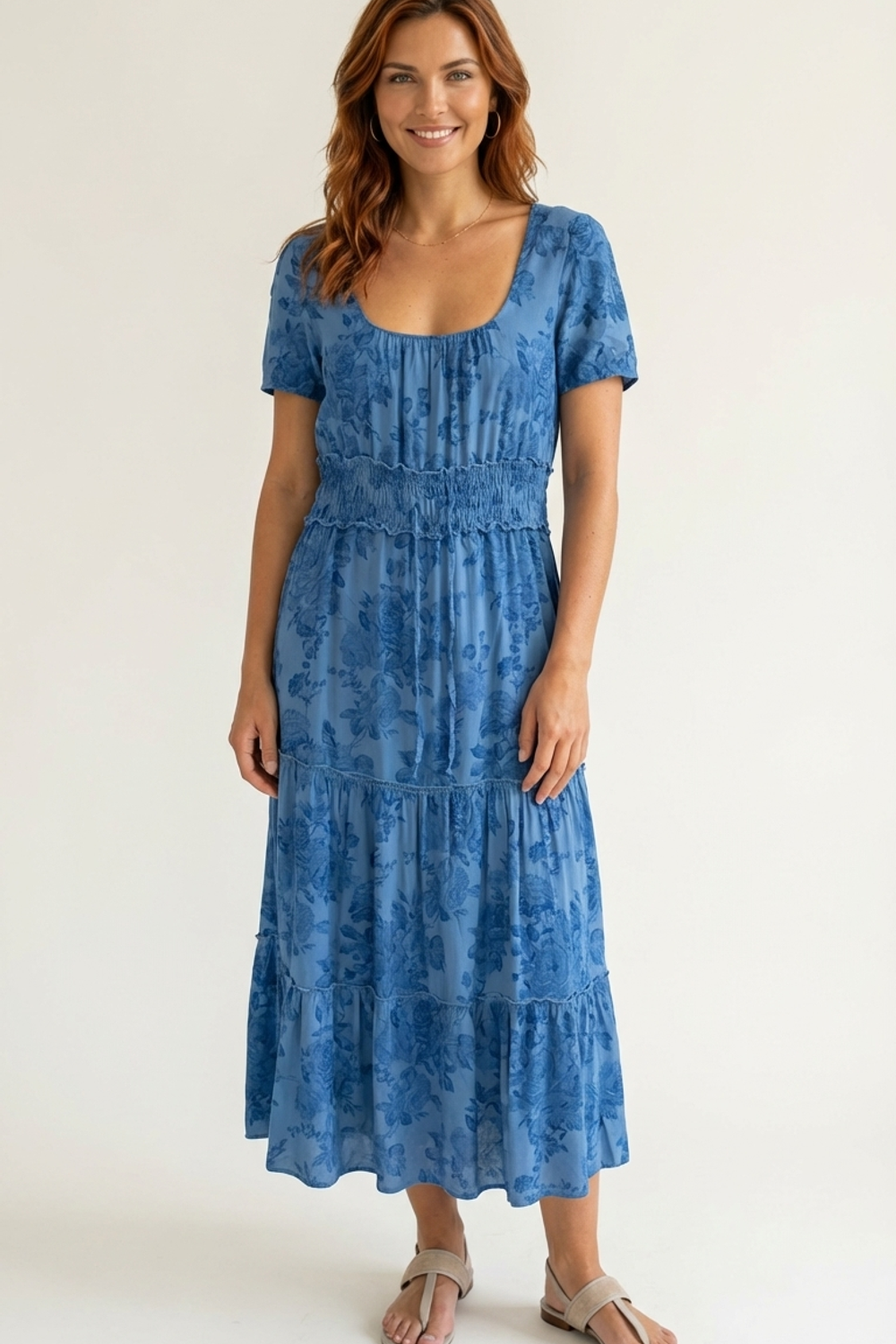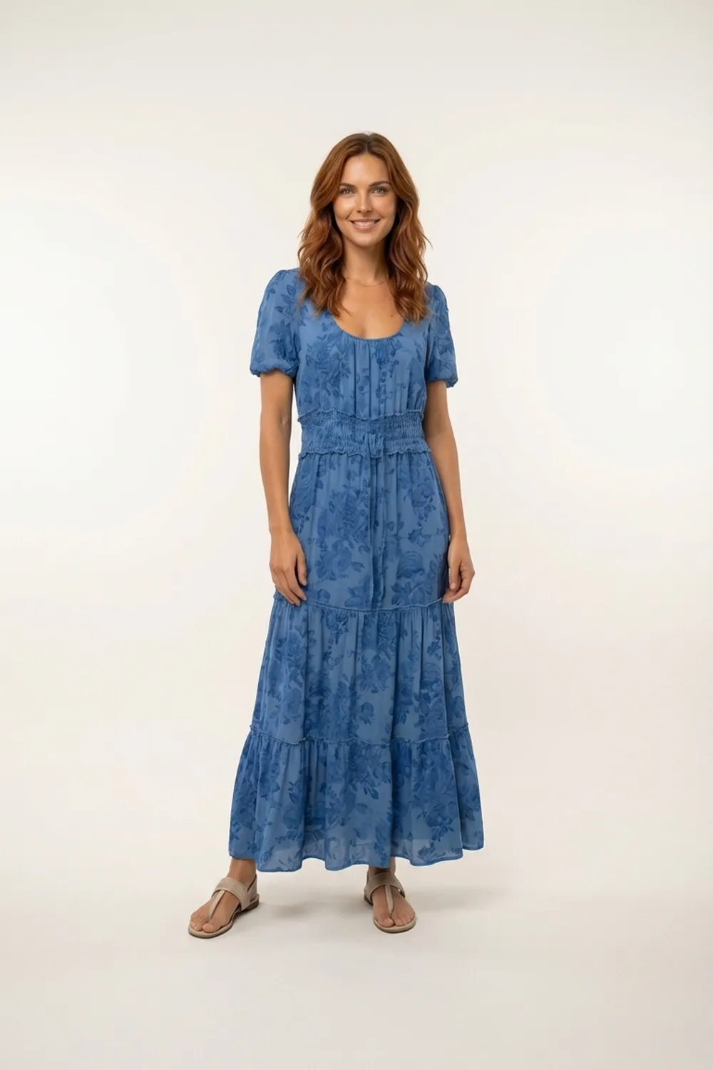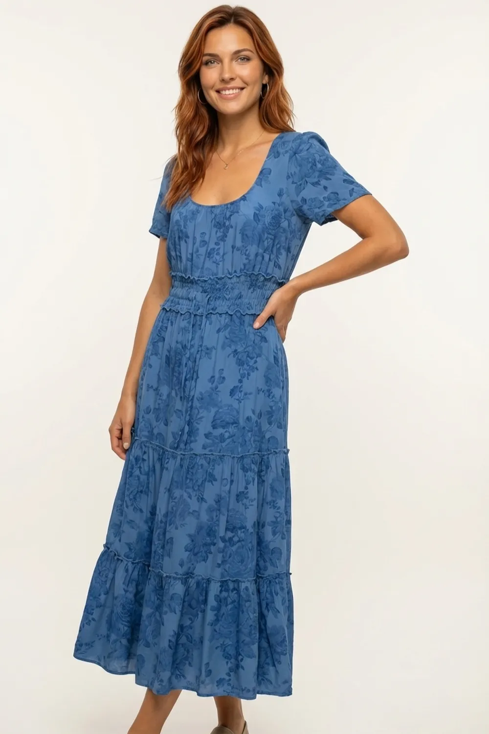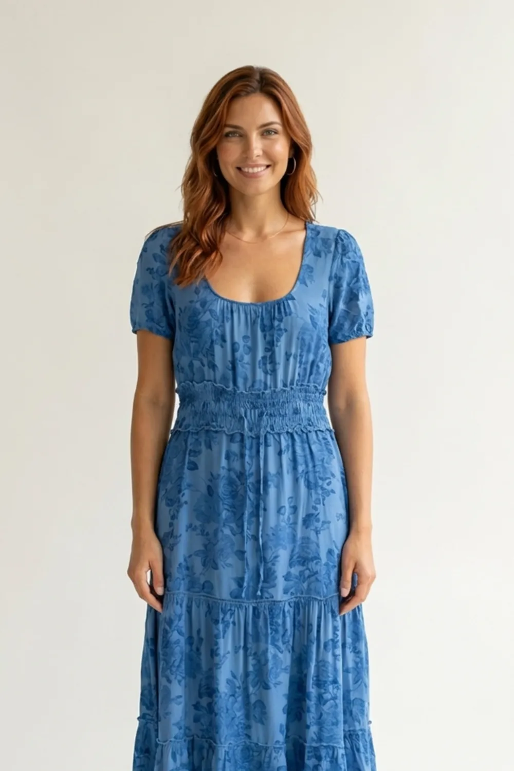 Son imprimé floral bleu ton sur ton et sa large taille smockée dessinent une silhouette gracieuse et féminine.